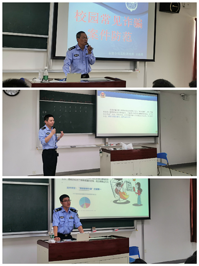 为加强学生安全意识,落实学院安全稳定工作,有效防范各类安全事件的发生,10月11日下午,开云官方网页版官网邀请上海市公安局奉贤分局高校派出所警官吴振霄、王淑敏、张志荣来到奉贤校区,为2019级全体新生进行防诈骗安全教育讲座。本次讲座以小班化的形式开展,共计开设6场,由辅导员王玉琳、王秋辰主持。