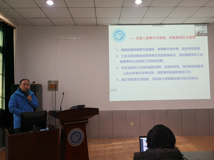 侯峰作机动学院第四届工会工作报告,分别从教代会履职、工会活动组织、教职工关爱以及工会今后的工作思路和重点工作等方面对学院工会工作进行了梳理和总结,并向大会汇报了学院工会经费的收支情况。
