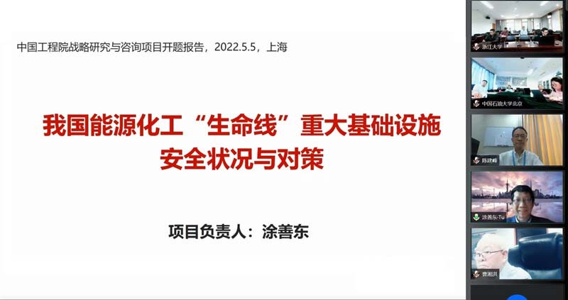 5月5日,中国工程院重点咨询项目“我国能源化工‘生命线’重大基础设施安全状况与对策”项目启动会通过视频形式召开。项目负责人涂善东院士主持会议,中国工程院党组成员、秘书长陈建峰院士出席会议并致辞,曹湘洪、王一德、王海舟、陈学东、郑津洋、张来斌等8位院士,二局樊新岩副局长及项目组主要成员共40余人参加会议。