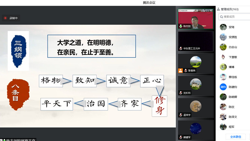 为进一步学习贯彻习近平总书记有关中华优秀传统文化的讲话精神,5月17日晚上,机动学院邀请上海市委党校马克思主义学院副院长,上海市委党校传统文化与马克思主义中国化研究中心主任陈方刘教授作题为“中国传统文化中的人生智慧”的报告,学院全体教职工通过腾讯会议参加学习。报告会由学院党委宣传委员王卫泽主持。