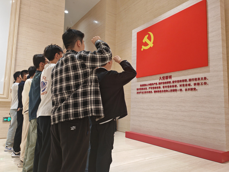 参观结束后,全体党员来到宣誓大厅,重温入党誓词。博士生第二党支部书记聂文睿领誓,在鲜红的党旗前,全体党员庄严宣誓。