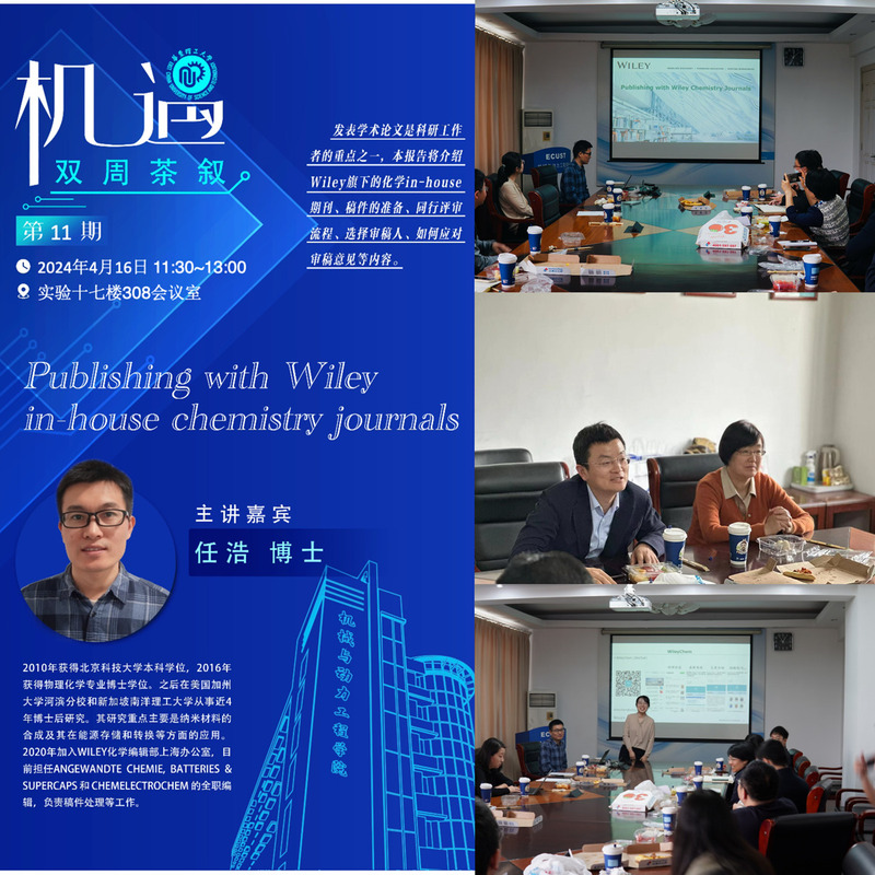 4月16日,“机·遇 双周茶叙”系列青年成长沙龙(第十一期)在徐汇校区举行。本期活动以“如何提高科研成果影响力”为话题,邀请全球知名出版机构John Wiley & Sons, Inc. 编辑部任浩博士就如何更好地发表科研成果做分享交流,吸引了机动、化工、生工、资环、材料等多个学院20余名师生参加。活动由机动学院青年教师张玉召集并主持。