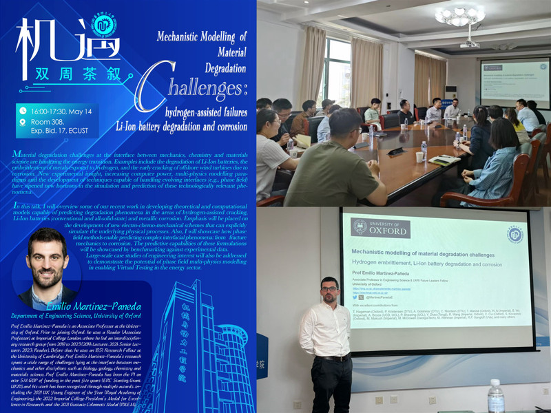 5月14日,“机·遇 双周茶叙”系列青年成长沙龙(第十二期)在徐汇校区举行。本次活动邀请了牛津大学Emilio Martínez-Pañeda教授来访华东理工大学机动学院,并作题为“Mechanistic Modeling of Material Degradation Challenges: Hydrogen-Assisted Failures Li-Ion Battery Degradation and Corrosion”的学术报告。本次活动由机动学院温建锋教授主持,学院二十余名教师和研究生同学参加了活动。