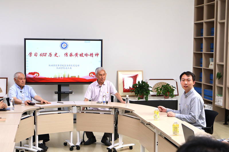 6月18日下午,机动学院奉贤校区本科生党支部在大学生活动中心107室开展主题党日活动。活动邀请学院退休老教师、曾全面参与“652工程”建设的蔡仁良、严思宏两位老先生走进奉贤园区,给学院思政教师和青年学生同上“学习652历史,传承黄坡岭精神”主题党课。各年级辅导员、支部学生党员和入党积极分子代表等20余人参加活动。