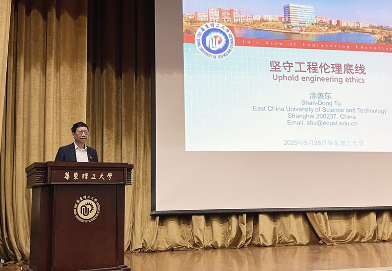 中国工程院院士涂善东为毕业生党员讲授主题为“坚守工程伦理底线,让党徽在工程一线闪光”的专题党课。他结合工业安全领域前沿理念,从工业技术发展史与典型事故案例双维度深入剖析安全内核,生动阐释“安全无小事”的底线思维。他以自身参与重大工程安全评审的经历为例,指出工程伦理绝非抽象概念,而是体现在图纸设计的细节推敲、施工现场的风险预判、技术应用的社会影响评估等每个环节。面对毕业生党员,他殷切嘱托:“要坚定理想信念、牢记党员身份、永葆党员本色,既要做技术创新的开拓者,更要成为工程伦理的守护者。”他呼吁青年学子将党徽的光芒融入工程实践,在化工、核电、航空航天、重大基础设施建设等领域坚守安全红线,精益求精,惟诚惟信,以科技造福人类为终极追求,让工程技术真正成为推动社会进步、保障民生福祉的坚实力量,在服务国家战略中彰显共产党员的使命担当。最后,涂院士带领全体毕业生党员诵读工科毕业生誓言,将工业安全警示与工程使命融入每一句誓言,让在场的毕业生党员深刻感受到工程事业的责任与担当,进一步增强了他们的工程使命感。