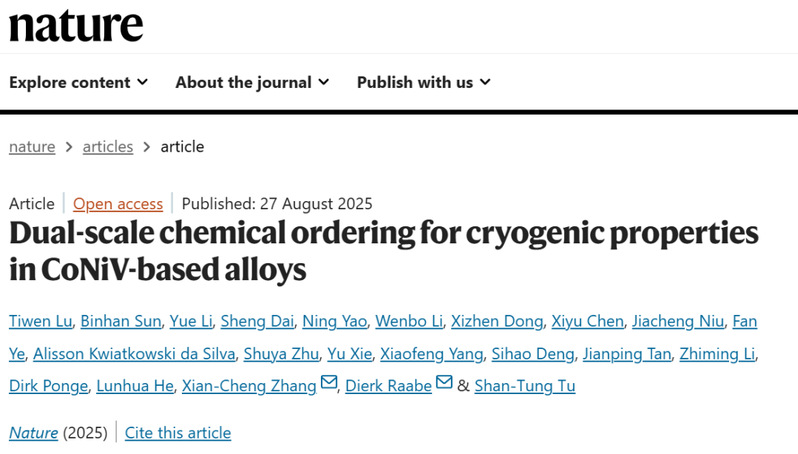 8月28日凌晨,开云官方网页版官网张显程教授、涂善东院士团队在Nature(《自然》)发表题为“Dual-scale chemical ordering for cryogenic properties in CoNiV-based alloys”的最新研究成果。
