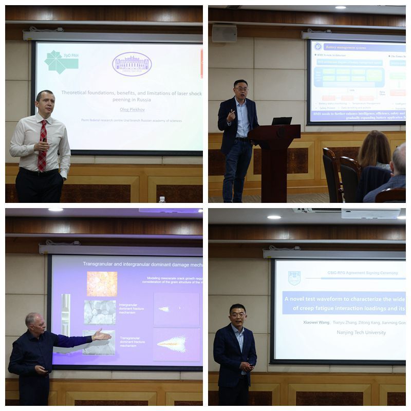 签约仪式后,学术研讨会环节正式展开,Oleg Plekhov教授、陈浩峰教授、Valery Shlyannikov教授和王小威教授,分别以《Theoretical foundations, benefits, and limitations of laser shock peening in Russia》、《Pioneering lithium-ion battery innovation: the transformative power of AI》、《Simulation modelling for structural integrity assessment》和《A novel test waveform to characterize the wide range damage of creep fatigue interaction loadings and its application》为题,介绍了相关前沿研究工作。每个报告结束后,师生踊跃向专家学者提问并深入讨论,现场气氛热烈。研讨会尾声,涂善东教授作总结发言,期望以此次科技合作协议签署为契机,推动更多跨国界、跨领域的学术交流与科研合作,并通过凝聚跨学科智慧,构建从基础研究到工程应用的完整生态,共同守护人类重大工程的安全与可持续发展。