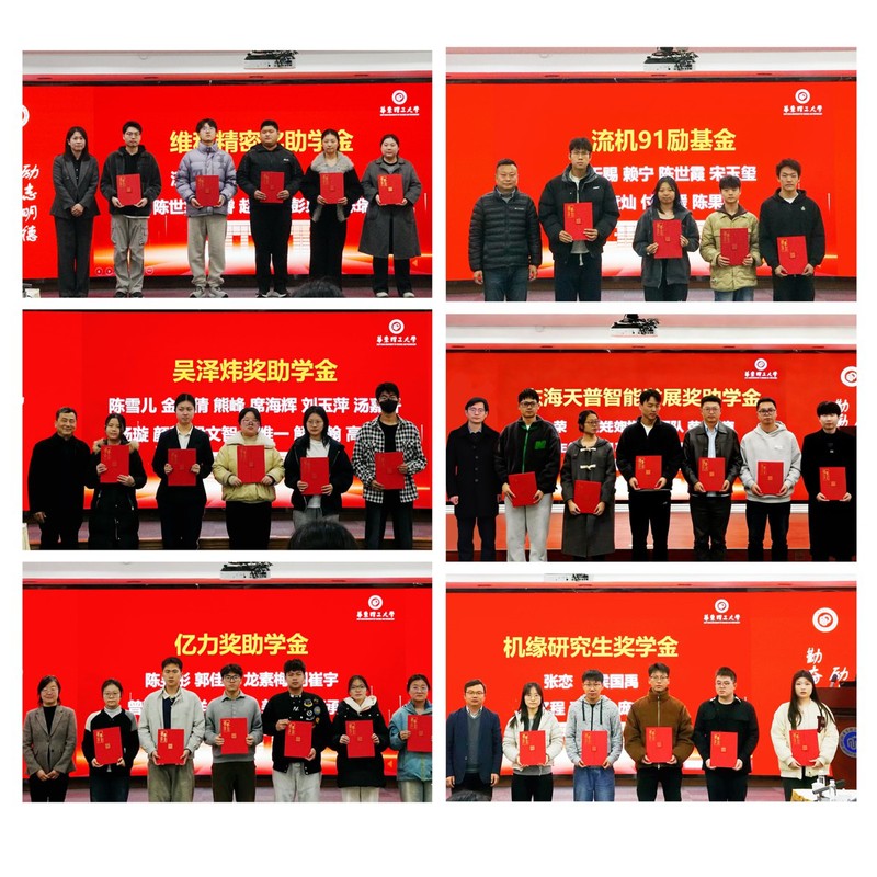 颁奖环节,姜颖、蔡晓卫、吴清、学院党委副书记李煜佳、副院长陈建钧和朱明亮分别为2025年度“维科精密奖助学金”“吴泽炜奖助学金”“流机91励基金”“亿力奖助学金”“东海天普智能发展奖助学金” 和“机缘研究生奖学金”的获奖学生颁发证书。